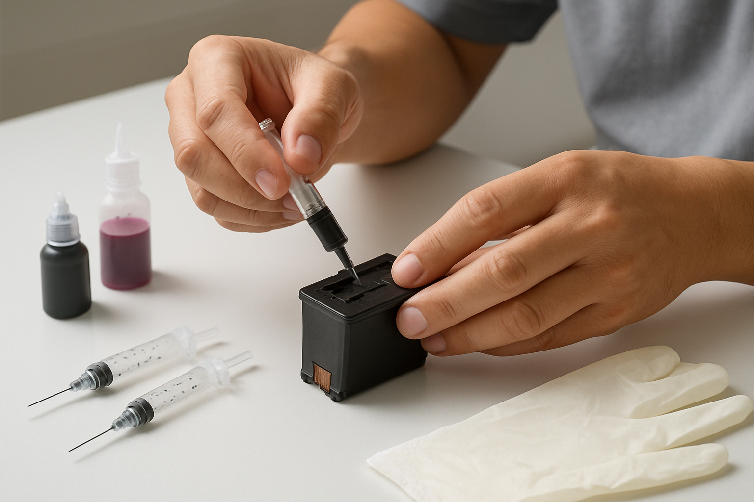 Mực mới được bơm từ từ theo đúng dung tích quy định. Mỗi màu đều có mức định lượng riêng – đen thường 60-70ml, màu khoảng 30-40ml tùy từng dòng máy. Sau khi đổ xong, cartridge được lắp lại và chạy chương trình vệ sinh đầu phun để đảm bảo mực chảy đều.